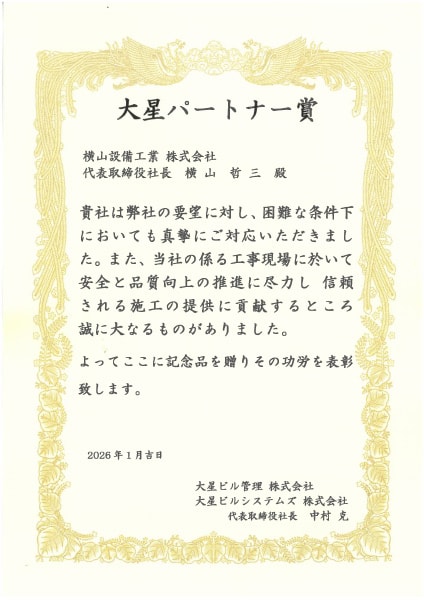 大星ビル管理(株)より、当社の工事施工について、『安全と品質向上の推進に尽力し、信頼される施工を提供した』として、「大星パートナー賞」が授与されました。