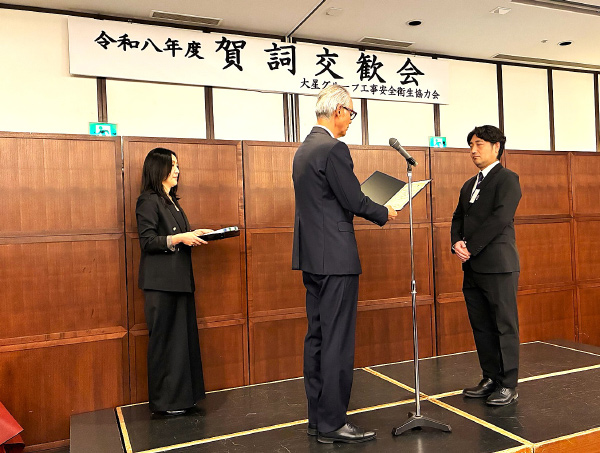 1月22日に開催された「大星グループ工事安全衛生協力会 賀詞交歓会」において、大星ビル管理(株)代表取締役社長 中村克 様から、当社常務取締役 横山喜一 宛、賞状並びに記念品が贈呈されました。